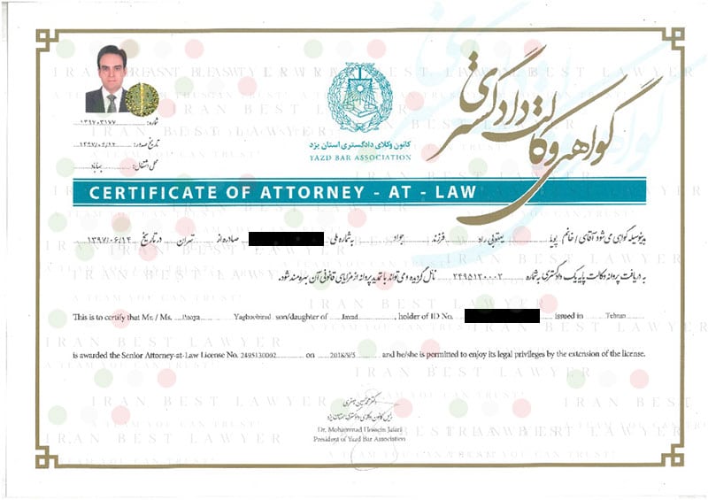 This certificate of First-grade Attorney at Law, has been issued to certify that an Iranian lawyer is entitled to plead before the Iranian courts even the Supreme Court of country.