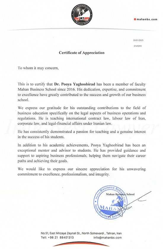 The letter of appreciation from Mahan Business School, the foremost business school in Iran, to Pooya Yaghoobirad is available here. This letter acknowledges and commends Mr. Yaghoobirad for his significant contributions and remarkable achievements as one of the influential professors at Mahan Business School.
